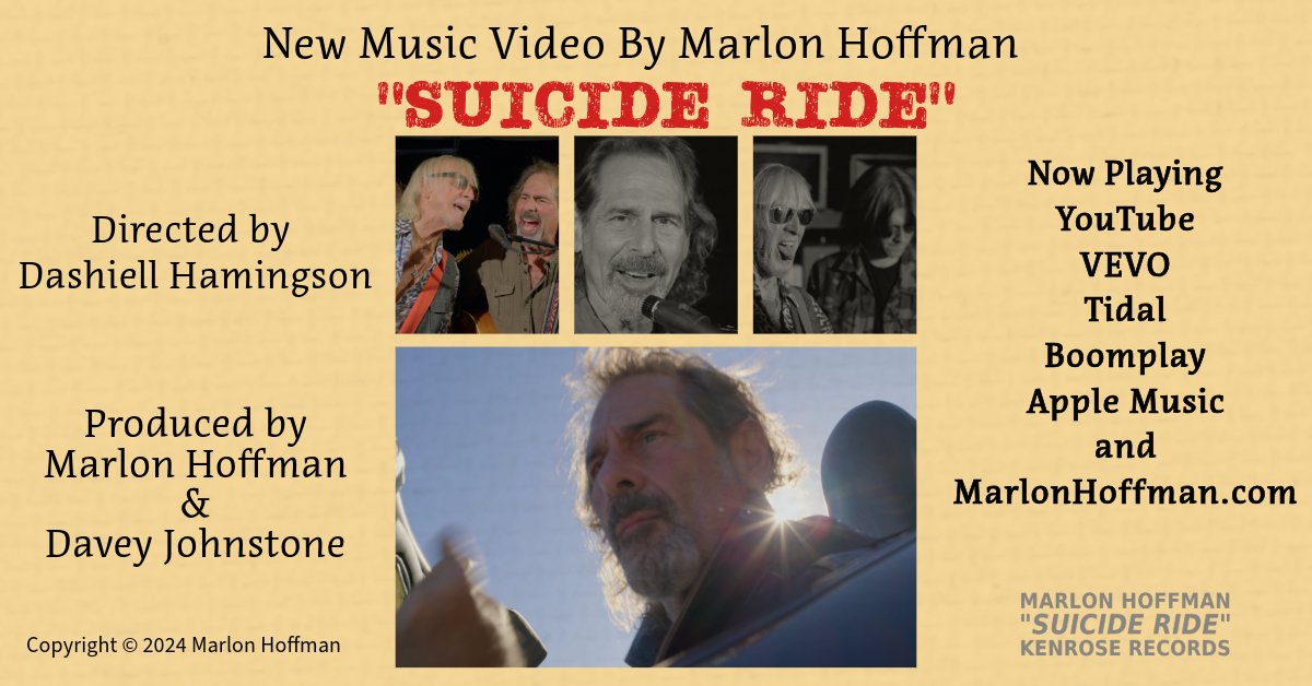 — Denny Seiwell (Original member of Wings) LOS ANGELES, CA, UNITED STATES, October 25, 2024 /EINPresswire.com/ -- A new music video for the guitar fueled rock revival song by Marlon Hoffman and Davey Johnstone, "Suicide Ride" was released today. It is the second music video from the recent album, HOLY MATTERS, co-produced by Hoffman (Marlon Hoffman Band) and Johnstone (Elton John Band). The official music video is directed by Dashiell Hamingson and produced by Marlon and Davey. The video was shot in the Santa Monica Mountains and at Hoffman’s Kenrose Studio in Los Angeles.